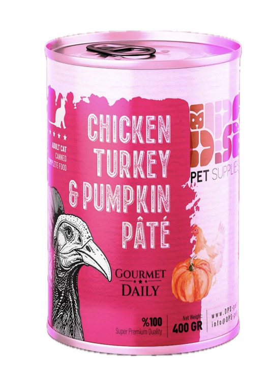 کنسرو غذای کامل گربه بالغ – مرغ، بوقلمون و کدو تنبل (پته)