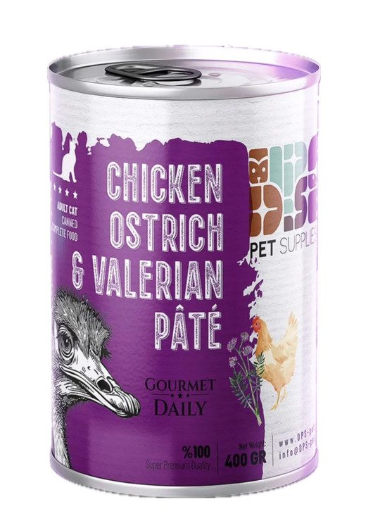 کنسرو غذای کامل گربه بالغ – مرغ، گوشت شترمرغ و سنبلالطیب (پته)