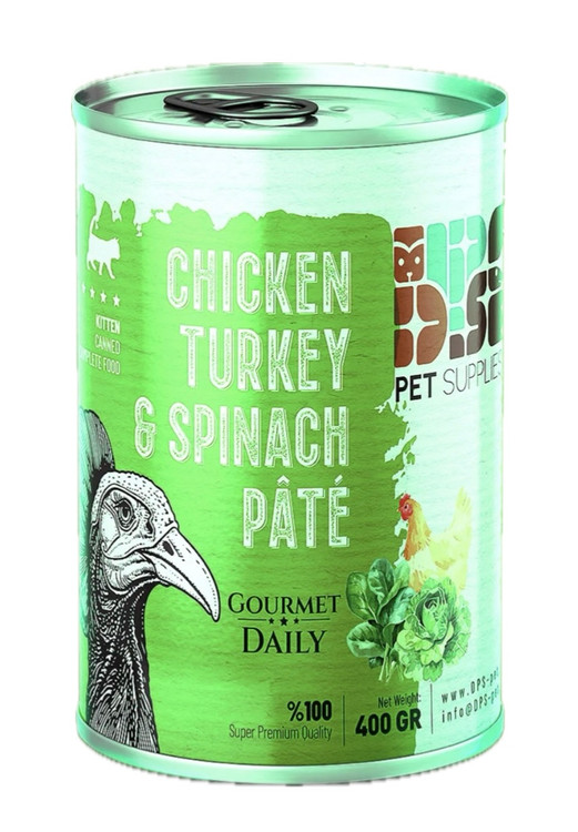 کنسرو غذای کامل بچهگربه با طعم مرغ، بوقلمون و اسفناج (پته).
